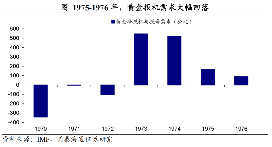 第三,美国财政部、IMF与苏联政府等抛售黄金,增加了黄金供给。在布雷顿森林体系解体后,为了维护美元作为全球储备资产的权威,美国并不希望黄金价格快速上涨。1975年1月与6月,美国财政部分别进行了两次黄金拍卖,规模分别为200万盎司和50万盎司。虽然抛售规模相比于黄金总供应量而言并不算大,但向市场传递了美国政府不愿容忍金价持续飙升的政策信号。