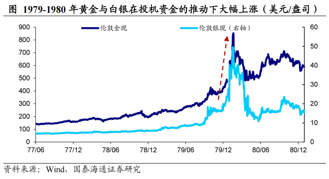 极端的投机情绪不仅推升了金价的飙升,也在白银市场上有明显体现。其中,最为典型的便是亨特兄弟试图垄断全球白银市场的逼空行为。当时亨特兄弟控制了大量的白银库存并在期货市场大举做多,白银价格从 1979 年 11 月的 16 美元 / 盎司暴涨至 1980 年 1 月的 49 美元 / 盎司。白银的非理性暴涨产生了强烈的溢出效应,也刺激了投机者对黄金的看涨情绪。白银和黄金的价格在 1980 年 1 月中下旬同步触及了历史高点。