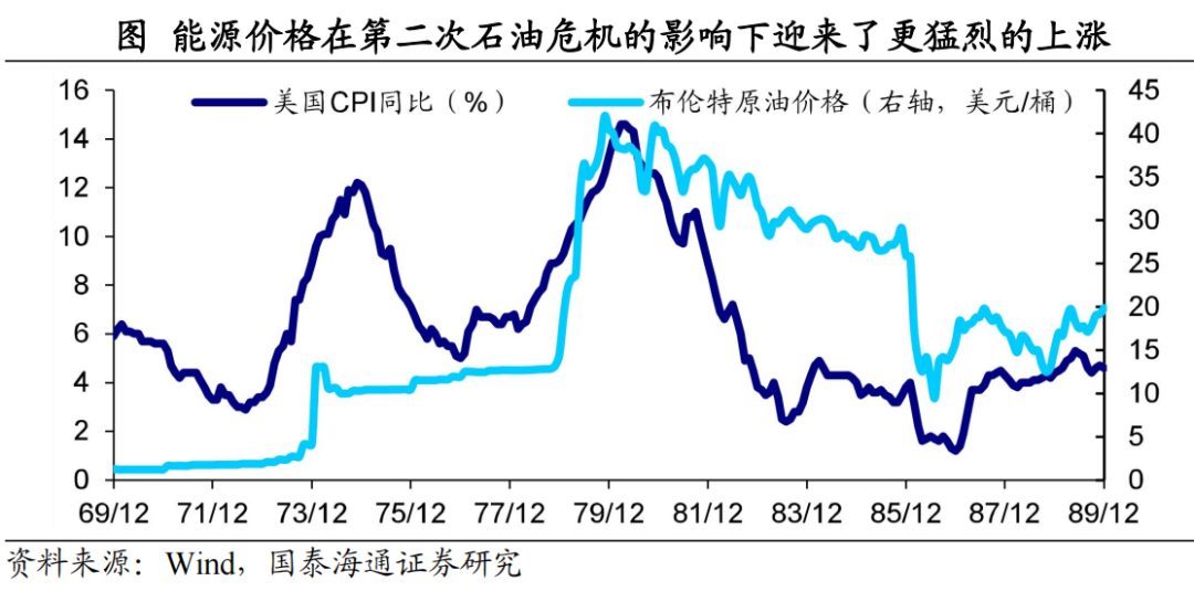 外部来看,地缘冲突带来的石油危机加速了通胀预期的失控。1973 年 10 月,第四次中东战争爆发,阿拉伯石油输出国组织对西方国家实施石油禁运,导致全球原油价格在短短几个月内从每桶约 3 美元飙升至超过 12 美元,涨幅高达 300% 以上。 1973 年 10 月美国 CPI 同比已处于 8.1% 的高位,后续在能源价格冲击下进一步上升到 1974 年 11 月 12.2% 的高位。