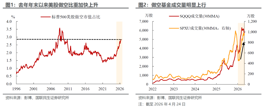 实际上,自去年年末起,受前期科技板块累计涨幅偏高、降息预期反复摇摆扰动,美股空头情绪便持续发酵;叠加伊朗地缘局势持续紧张,看空情绪进一步加速升温。截至3月末,美股做空市值占比一度攀升至2.8%,仅次于2008年;与此同时,SQQQ、SPXU等指数做空类ETF交易规模显著放量,充分反映出资金对美股后续上行空间的质疑。