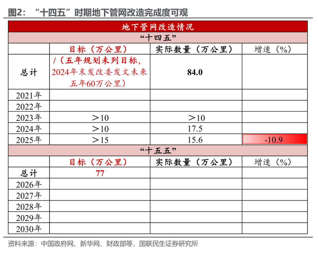 城市地下管网:是保障城市运行的“生命线”。“十五五”规划敲定5万亿投资、70万公里建设改造目标,旨在全面补齐城市基础设施短板。从进度看,过去两年地下管网改造已超额完成,“十五五”继续加速部署,投资重点聚焦三大方向:燃气供水管网更新根治安全隐患、综合管廊终结“马路拉链”,排水防涝与智慧监测解决内涝痛点。
