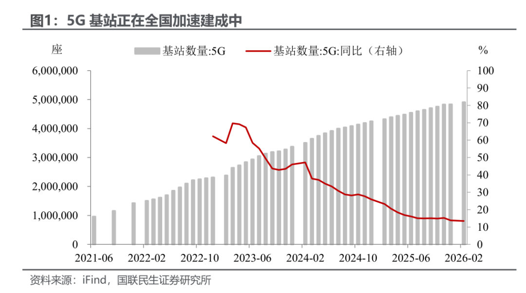 新一代通信网:数字经济的“神经中枢”。新一代通信网是数字中国建设的底层支撑。“十五五”规划明确加快5G-A规模商用、前瞻布局6G,并将万兆光网试点列为重点任务。截至2026年3月,全国5G基站超495万个,实现“县县通千兆、乡乡通5G”,5G-A覆盖超330城,万兆光网在168个区域率先试点。