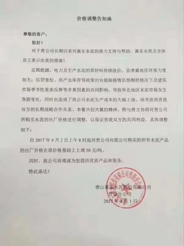 冀东水泥发布涨价函,4月2日上午8时起上调所有水泥产品出厂价50元/吨。 风险提示及免责条款 市场有风险,投资需谨慎。本文不构成个人投资建议,也未考虑到个别用户特殊的投资目标、财务状况或需要。用户应考虑本文中的任何意见、观点或结论是否符合其特定状况。据此投资,责任自负。