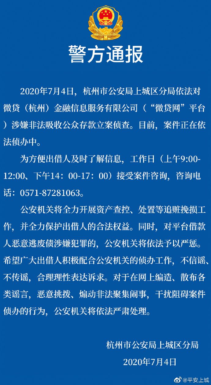 2020年7月4日,杭州市公安局上城区分局依法对微贷(杭州)金融信息服务有限公司(“微贷网”平台)涉嫌非法吸收公众存款立案侦查。目前,案件正在依法侦办中。 风险提示及免责条款 市场有风险,投资需谨慎。本文不构成个人投资建议,也未考虑到个别用户特殊的投资目标、财务状况或需要。用户应考虑本文中的任何意见、观点或结论是否符合其特定状况。据此投资,责任自负。