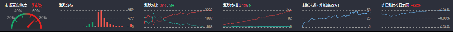 3、两市共3216只个股上涨,172只个股涨停,除新股外涨停163只;567只个股下跌,6只个股跌停,40只股票炸板,炸板率22%。