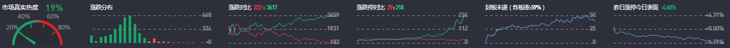 3、两市共222只个股上涨,38只个股涨停,除新股外涨停29只;3617只个股下跌,218只个股跌停,29只股票炸板,炸板率59%。
