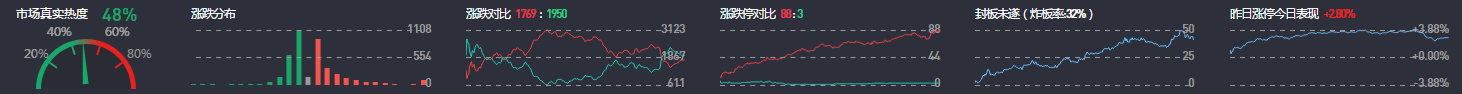 3、两市共1769只个股上涨,94只个股涨停,除新股外涨停88只;1950只个股下跌,3只个股跌停,36只股票炸板,炸板率32%。