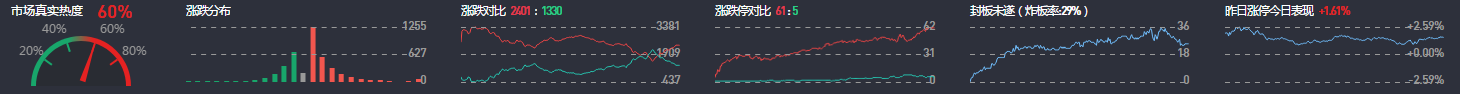 3、两市共2401只个股上涨,68只个股涨停,除新股外涨停61只;1330只个股下跌,5只个股跌停。21只股票炸板,炸板率29%。