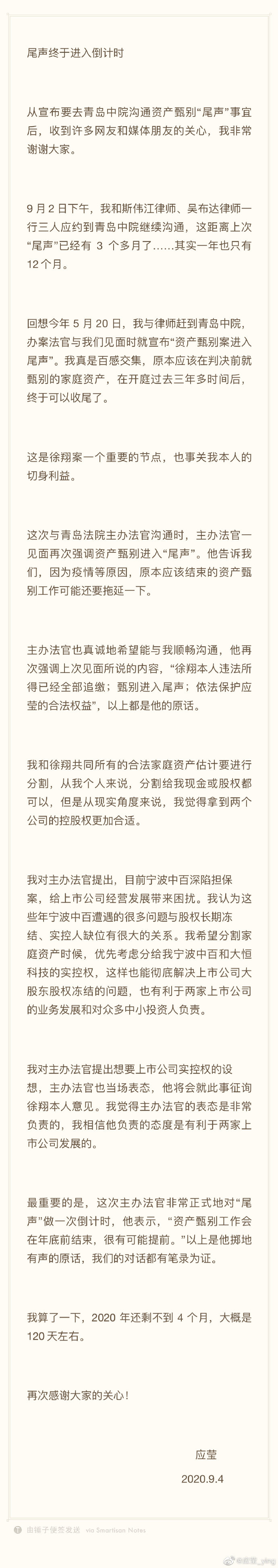 徐翔妻子应莹发微博表示,青岛中院主办法官称“ 资产甄别工作会在年底前结束,很有可能提前”。 风险提示及免责条款 市场有风险,投资需谨慎。本文不构成个人投资建议,也未考虑到个别用户特殊的投资目标、财务状况或需要。用户应考虑本文中的任何意见、观点或结论是否符合其特定状况。据此投资,责任自负。