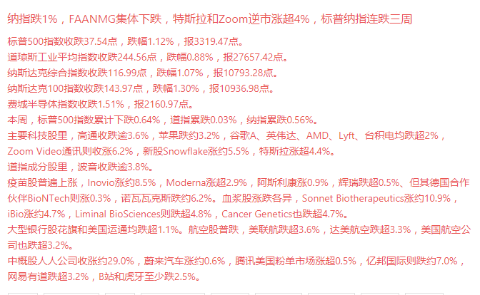 【纳指跌1%,FAANMG集体下跌,特斯拉和Zoom逆市涨超4%,标普纳指连跌三周】标普500指数收跌37.54点,跌幅1.12%,报3319.47点。