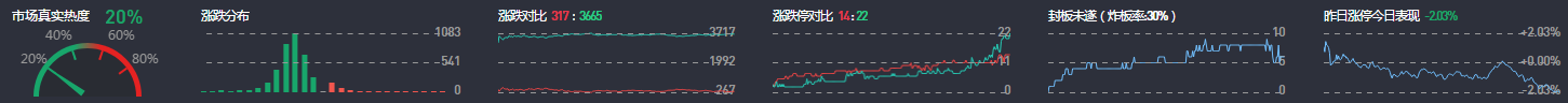 3、两市共317只个股上涨,24只个股涨停,除新股外涨停14只;3665只个股下跌,22只个股跌停。6只股票炸板,炸板率30%。
