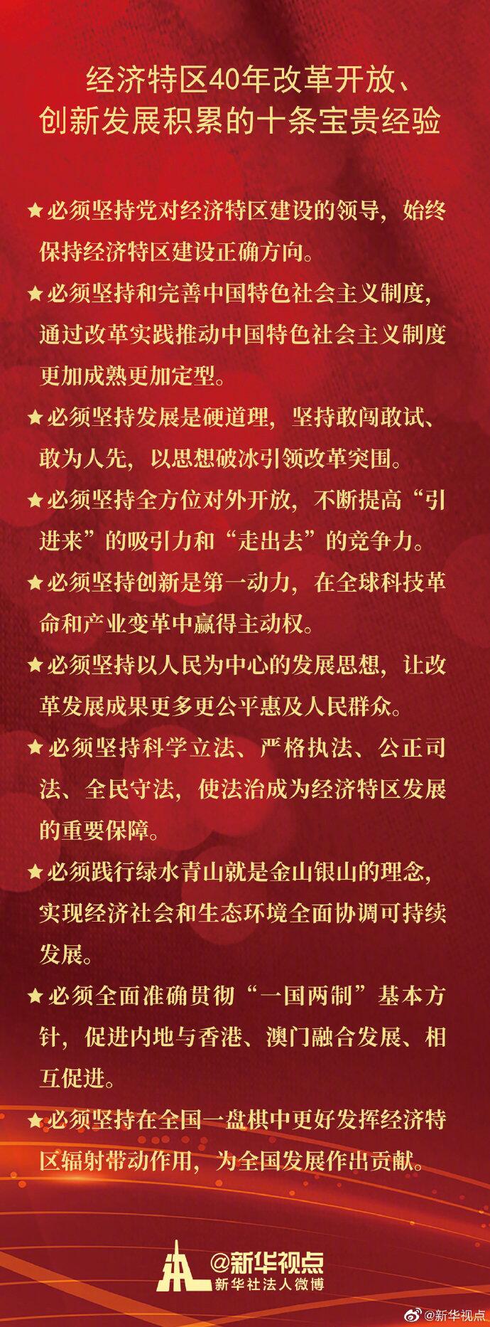 【习近平:经济特区40年改革开放、创新发展积累了十条宝贵经验】1、必须坚持党对经济特区建设的领导,始终保持经济特区建设正确方向。