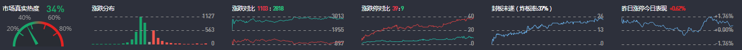 3、两市共1103只个股涨,43只个股涨停,除新股外涨停39只;2818只个股下跌,9只个股跌停,19只股票炸板,炸板率37%。
