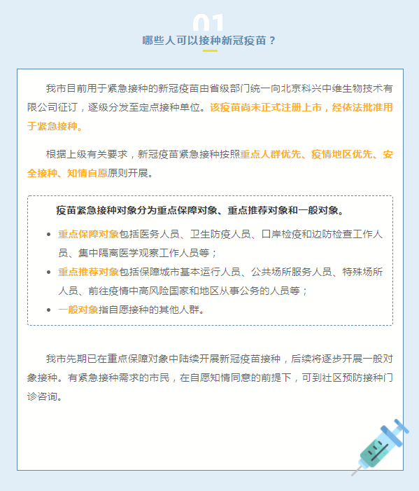 【嘉兴疾控:如有紧急接种新冠疫苗需求可到社区咨询,2支共400元】15日,浙江省嘉兴市疾病预防控制中心“嘉兴疾控”发文《新冠疫苗接种的有关说明》,介绍了新型冠状病毒疫苗接种事宜。“嘉兴疾控”指出,嘉兴市目前用于紧急接种的新冠疫苗由省级部门统一向北京科兴中维生物技术有限公司征订,逐级分发至定点接种单位。该疫苗尚未正式注册上市,经依法批准用于紧急接种。需要接种2剂次,间隔14-28天(推荐间隔28天),疫苗价格为200元/支(瓶),2剂次共400元。(中国青年报)