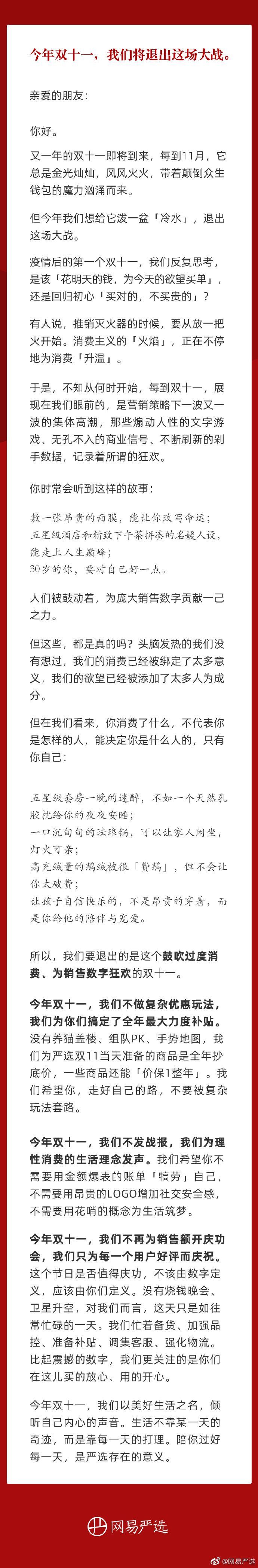 网易严选官方微博表示,将退出今年双十一。 风险提示及免责条款 市场有风险,投资需谨慎。本文不构成个人投资建议,也未考虑到个别用户特殊的投资目标、财务状况或需要。用户应考虑本文中的任何意见、观点或结论是否符合其特定状况。据此投资,责任自负。