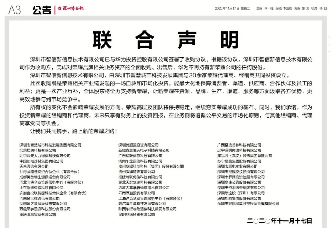 【华为出售荣耀:30余家代理商接盘自救】今日(17日)多家企业在《深圳特区报》发布联合声明,深圳市智信新信息技术有限公司已与华为投资控股有限公司签署了收购协议,完成对荣耀品牌相关业务资产的全面收购。出售后,华为不再持有新荣耀公司的任何股份。声明指出,此次收购既是荣耀相关产业链发起的一场自救和市场化投资,更是一次产业互补。知情人士指出,华为被美国持续打压以来,荣耀的供应商、生产工厂、渠道和分销商都面临困难。这种情况下,华为出售荣耀,是在“保护渠道有水流,别干枯了,别害了上下游”。