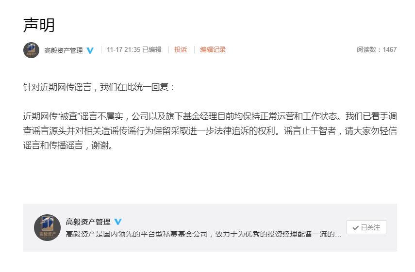 高毅资产发布声明:近期网传“被查”谣言不属实,公司以及旗下基金经理目前均保持正常运营和工作状态。 风险提示及免责条款 市场有风险,投资需谨慎。本文不构成个人投资建议,也未考虑到个别用户特殊的投资目标、财务状况或需要。用户应考虑本文中的任何意见、观点或结论是否符合其特定状况。据此投资,责任自负。