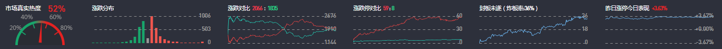 3、两市共2066只个股涨,60只个股涨停,除新股外涨停59只;1835只个股下跌,8只个股跌停,26只股票炸板,炸板率36%。
