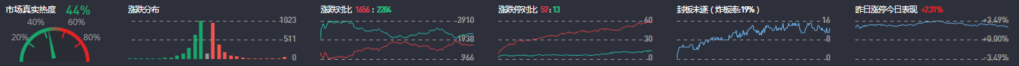 3、两市共1656只个股涨,57只个股涨停,除新股外涨停57只;2284只个股下跌,13只个股跌停,7只股票炸板,炸板率19%。