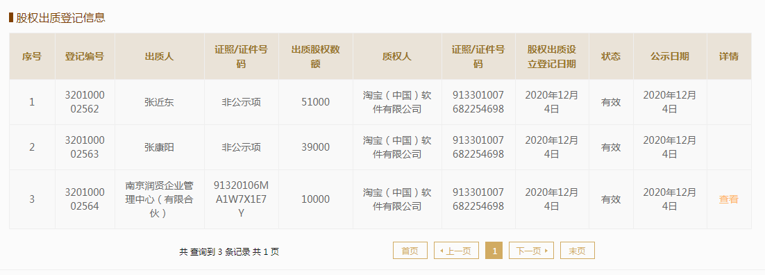 【张近东等将苏宁控股全部股权质押给阿里巴巴旗下公司】国家企业信用信息公示系统披露,苏宁控股集团股东张近东、张康阳及南京润贤企业管理中心(有限合伙)已将公司全部股权出质给淘宝(中国)软件有限公司。股权出质登记日期为2020年12月4日,合计出质股权数额10亿元人民币,与苏宁控股集团的注册资本金额等同。