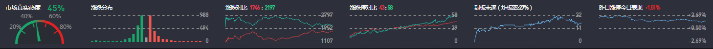 3、两市共1746只个股涨,46只个股涨停,除新股外涨停43只;2197只个股下跌,58只个股跌停,12只股票炸板,炸板率27%。
