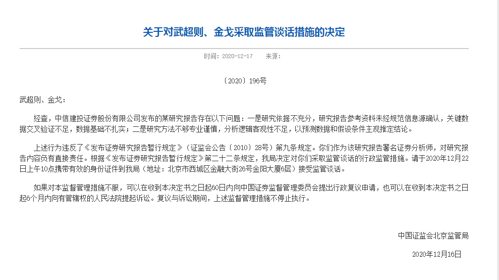 【因署名研报存在问题,中信建投武超则被北京证监局约谈】今日,北京证监局在官网发布一则处罚决定称,经查,中信建投发布的某研究报告存在研究依据不充分、研究方法不够专业谨慎等问题。根据根据《发布证券研究报告暂行规定》第二十二条规定,北京证监局决定对该研究报告署名证券分析师武超则、金戈采取监管谈话的行政监管措施。就在十多天前,北京证监局同样曾因为中信建投的研报问题发布对公司采取责令改正措施的决定。(每经网)