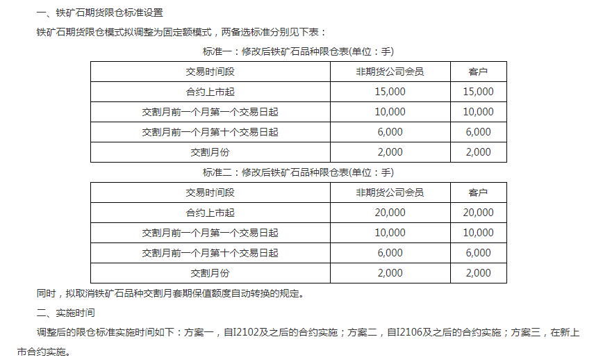 大商所就调整铁矿石持仓限额公开征求意见:铁矿石期货限仓模式拟调整为固定额模式,有两备选标准;拟取消铁矿石品种交割月套期保值额度自动转换的规定。 风险提示及免责条款 市场有风险,投资需谨慎。本文不构成个人投资建议,也未考虑到个别用户特殊的投资目标、财务状况或需要。用户应考虑本文中的任何意见、观点或结论是否符合其特定状况。据此投资,责任自负。