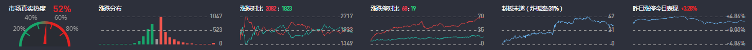 3、两市共2082只个股涨,69只个股涨停,除新股外涨停68只;1823只个股下跌,19只个股跌停,18只股票炸板,炸板率31%。