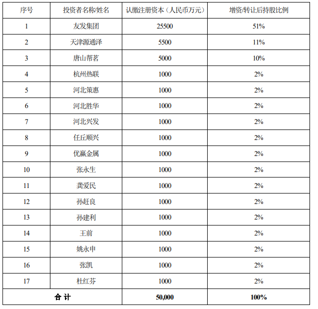 【友发集团:子公司拟通过出资权转让及增资扩股方式引进16家投资者】友发集团公告,为进一步增强公司全资子公司唐山友发新型建材的资本实力,深化合作,提高产品竞争力,该公司拟通过出资权转让及增资扩股方式引进16家投资者,该公司原注册资本30,000万元,均由本公司认缴,尚未实缴。现拟将其中4,500万元的出资权转让给唐山帮茗,同时新引进的投资者共同增资20,000万元,出资权转让及增资事项完成后,唐山友发新型建材认缴注册资本金额及相应持股比例如图。