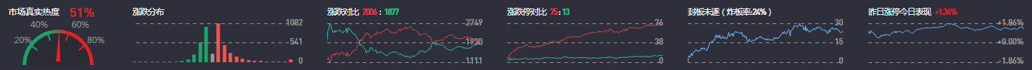3、两市共2006只个股涨,77只个股涨停,除新股外涨停75只;1877只个股下跌,13只个股跌停,18只股票炸板,炸板率24%。
