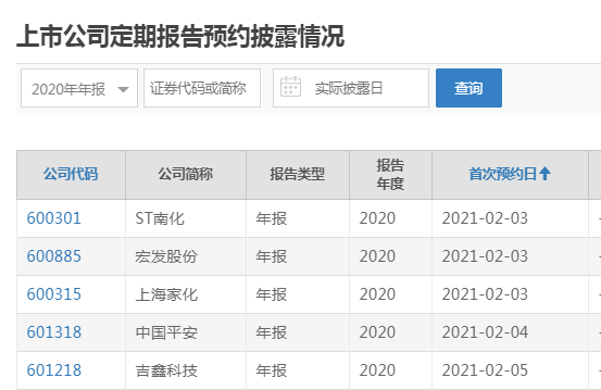 上交所年报预约披露时间表出炉,ST南化、宏发股份、上海家化将于2021年2月3日率先披露,中国平安、吉鑫科技将于2月4日、5日披露。 风险提示及免责条款 市场有风险,投资需谨慎。本文不构成个人投资建议,也未考虑到个别用户特殊的投资目标、财务状况或需要。用户应考虑本文中的任何意见、观点或结论是否符合其特定状况。据此投资,责任自负。
