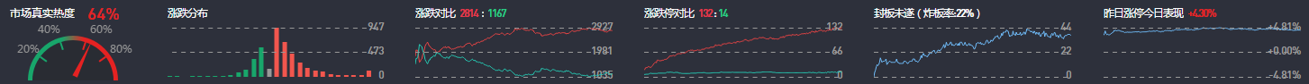 3、两市共2814只个股涨,135只个股涨停,除新股外涨停132只;1167只个股下跌,14只个股跌停,32只股票炸板,炸板率22%。