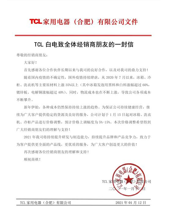 TCL发布涨价函:因原材料和物流成本上涨,TCL计划于1月15日期对冰箱、洗衣机、冷柜涨价5%-15%。(科技J) 风险提示及免责条款 市场有风险,投资需谨慎。本文不构成个人投资建议,也未考虑到个别用户特殊的投资目标、财务状况或需要。用户应考虑本文中的任何意见、观点或结论是否符合其特定状况。据此投资,责任自负。