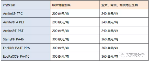 帝斯曼宣布2月1日起提高其在欧洲、北美、南美和亚太地区的特种工程材料价格,欧洲地区涨幅200-300欧元/吨,亚太、南美、北美地区涨幅240-360美元/吨。(艾邦高分子网) 风险提示及免责条款 市场有风险,投资需谨慎。本文不构成个人投资建议,也未考虑到个别用户特殊的投资目标、财务状况或需要。用户应考虑本文中的任何意见、观点或结论是否符合其特定状况。据此投资,责任自负。