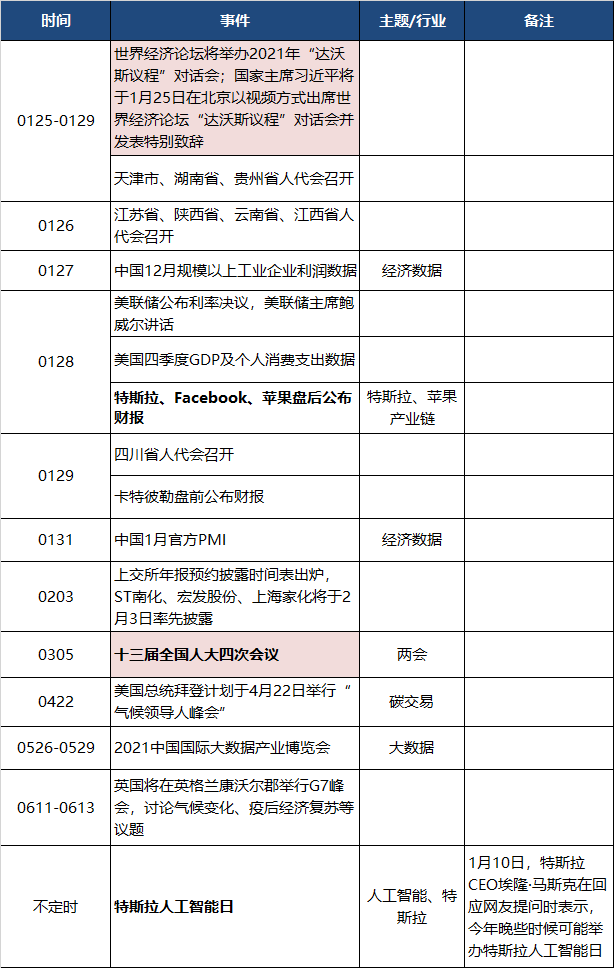 投资日历 | 1月25日-1月31日关注:打新、“达沃斯议程”对话会、特斯拉苹果财报、地方两会。 风险提示及免责条款 市场有风险,投资需谨慎。本文不构成个人投资建议,也未考虑到个别用户特殊的投资目标、财务状况或需要。用户应考虑本文中的任何意见、观点或结论是否符合其特定状况。据此投资,责任自负。