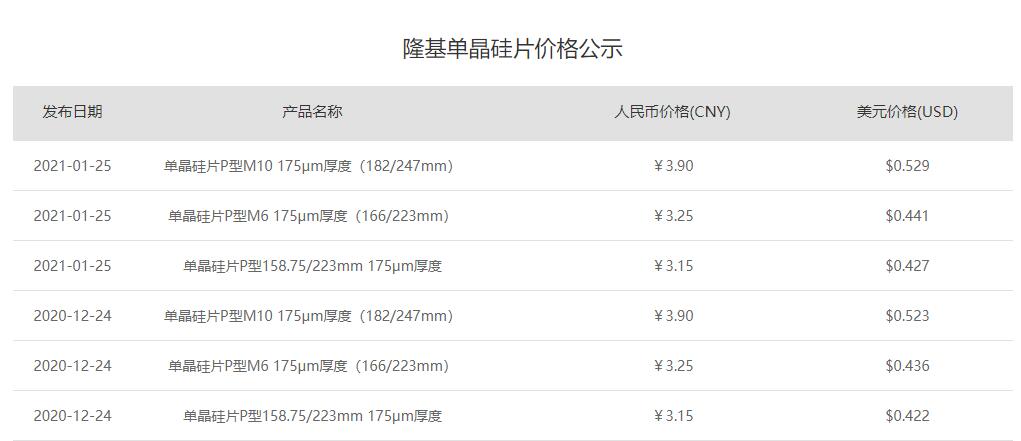 1月25日,隆基公布单晶硅片最新报价,所有尺寸均维持不变,其中158.75mm单晶硅片价格3.15元/片;166mm单晶硅片价格3.25元/片;182mm单晶硅片价格3.9元/片。 风险提示及免责条款 市场有风险,投资需谨慎。本文不构成个人投资建议,也未考虑到个别用户特殊的投资目标、财务状况或需要。用户应考虑本文中的任何意见、观点或结论是否符合其特定状况。据此投资,责任自负。