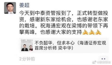 【姜超确认加盟中泰资管,出任联席首席投资官】姜超今日在朋友圈转发继任者梁中华文章,并称已到中泰资管报道。 风险提示及免责条款 市场有风险,投资需谨慎。本文不构成个人投资建议,也未考虑到个别用户特殊的投资目标、财务状况或需要。用户应考虑本文中的任何意见、观点或结论是否符合其特定状况。据此投资,责任自负。