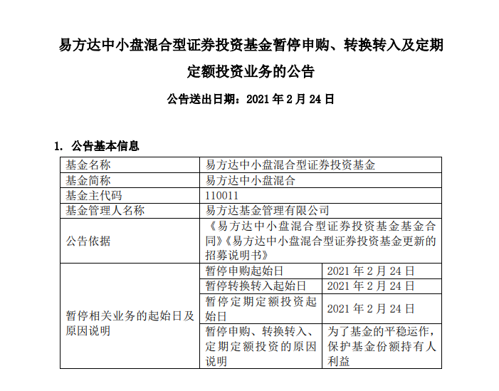 【张坤管理的易方达中小盘停止申购,同时宣布大额分红】为了基金的平稳运作,保护基金份额持有人利益,易方达中小盘混合2月24日起暂停易方达中小盘混合型证券投资基金在非直销销售机构、本公司网上直销系统的申购、转换转入及定期定额投资业务。此外,易方达中小盘还发了分红公告,本次分红为9元/10份基金份额。权益登记日2021年2月25日,现金红利发放日2021年2月26日。