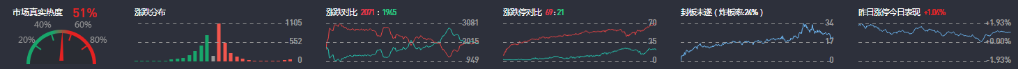 3、两市共2071只个股涨,71只个股涨停,除新股外涨停69只;1945只个股下跌,21只个股跌停,12只股票炸板,炸板率24%。