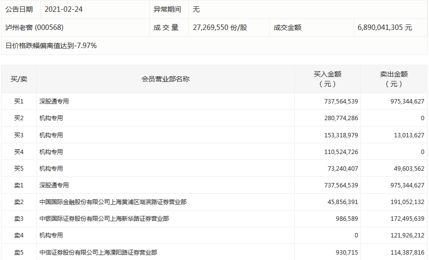 【泸州老窖跌停,四个机构席位买入逾6亿元】泸州老窖今日跌停。盘后数据显示,深股通卖出9.75亿元并买入7.38亿元,中金公司上海湖滨路卖出1.9亿元。一机构卖出1.22亿元,四机构买入6.18亿元。 风险提示及免责条款 市场有风险,投资需谨慎。本文不构成个人投资建议,也未考虑到个别用户特殊的投资目标、财务状况或需要。用户应考虑本文中的任何意见、观点或结论是否符合其特定状况。据此投资,责任自负。