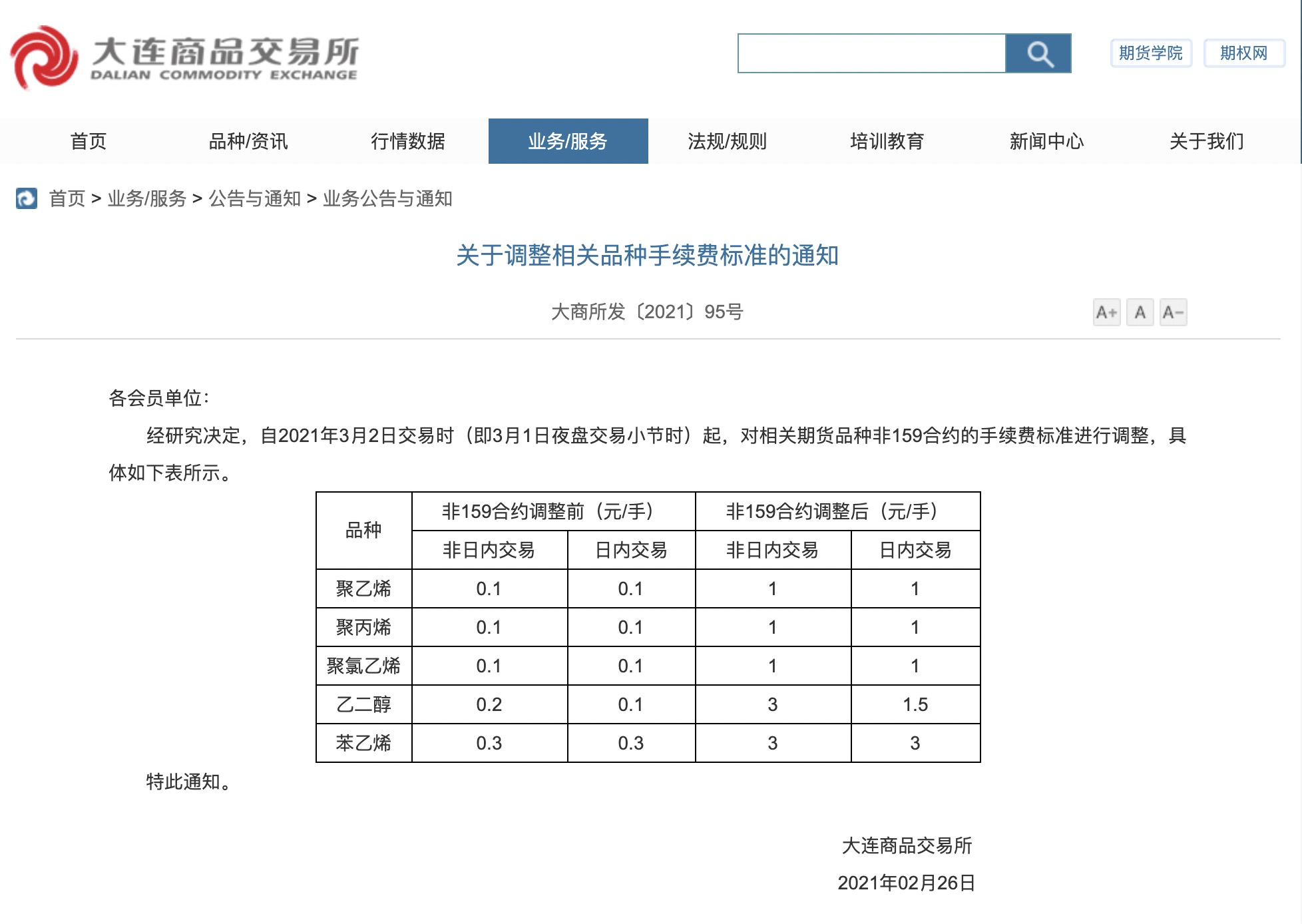【大商所调整聚乙烯、聚丙烯等5个品种手续费标准】自2021年3月2日交易时(即3月1日夜盘交易小节时)起,对聚乙烯、聚丙烯、聚氯乙烯、乙二醇、苯乙烯非159合约的手续费标准进行调整。 风险提示及免责条款 市场有风险,投资需谨慎。本文不构成个人投资建议,也未考虑到个别用户特殊的投资目标、财务状况或需要。用户应考虑本文中的任何意见、观点或结论是否符合其特定状况。据此投资,责任自负。
