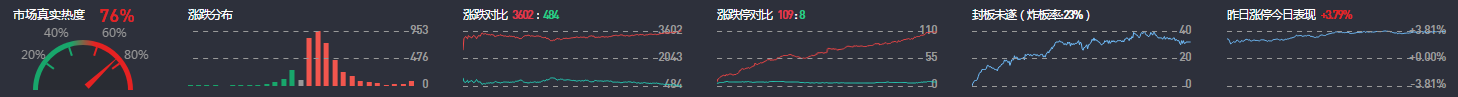 3、两市共3402只个股涨,111只个股涨停,除新股外涨停109只;484只个股下跌,8只个股跌停,23只股票炸板,炸板率23%。