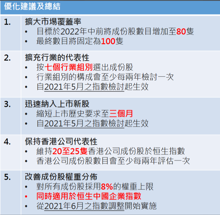 5、改善成份股权重分布。对所有成份股采用8%的权重上限。同时适用于恒生中国企业指数。从2021年6月之指数调整开始实施。
