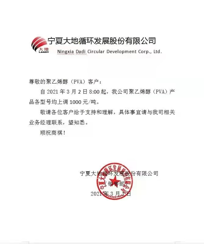 宁夏大地循环发展有限公司1日发布通知,3月2日8时起,公司聚乙烯醇产品各型号均上调1000元/吨。 风险提示及免责条款 市场有风险,投资需谨慎。本文不构成个人投资建议,也未考虑到个别用户特殊的投资目标、财务状况或需要。用户应考虑本文中的任何意见、观点或结论是否符合其特定状况。据此投资,责任自负。