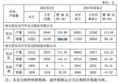 东安动力:哈尔滨东安汽车动力股份有限公司2月发动机销量31023台,同比增长204.30%。 风险提示及免责条款 市场有风险,投资需谨慎。本文不构成个人投资建议,也未考虑到个别用户特殊的投资目标、财务状况或需要。用户应考虑本文中的任何意见、观点或结论是否符合其特定状况。据此投资,责任自负。