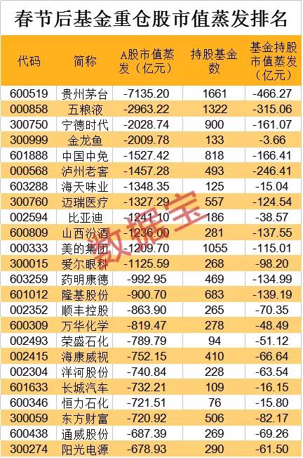 【基金重仓股春节后市值蒸发超5万亿】春节以来,基金重仓股大幅回调,数据宝统计,2020年末持股基金数量50家以上的股票有168只股票,上述股票节后平均下跌12.74%,大幅跑输同期沪指(-4.15%)。节后跌幅超30%的有8只股票,通策医疗累计下跌40%,跌幅最大,阳光电源、爱美客、重庆啤酒、山西汾酒等个股跌幅均超过30%。(数据宝)