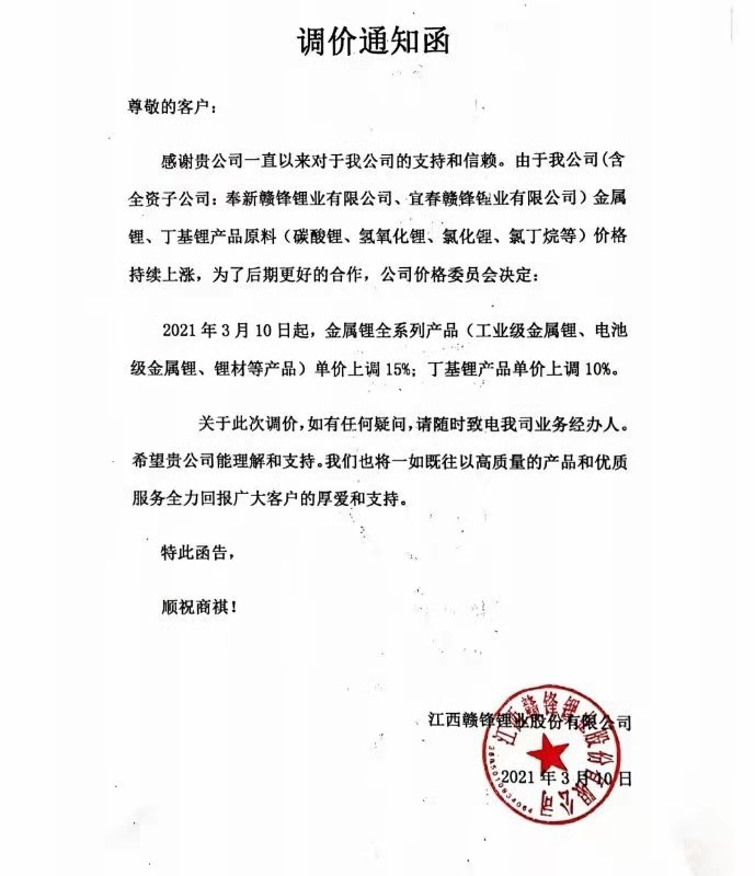 赣锋锂业调价通知函显示,因产品原料价格持续上涨,3月10日起,金属锂全系列产品(工业级金属锂、电池级金属锂、锂材等产品)单价上调15%,丁基锂产品单价上调10%。 风险提示及免责条款 市场有风险,投资需谨慎。本文不构成个人投资建议,也未考虑到个别用户特殊的投资目标、财务状况或需要。用户应考虑本文中的任何意见、观点或结论是否符合其特定状况。据此投资,责任自负。