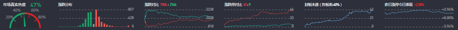 3、两市共1906只个股上涨,63只个股涨停,除新股外涨停61只;2144只个股下跌,9只个股跌停。33只股票炸板,炸板率40%。