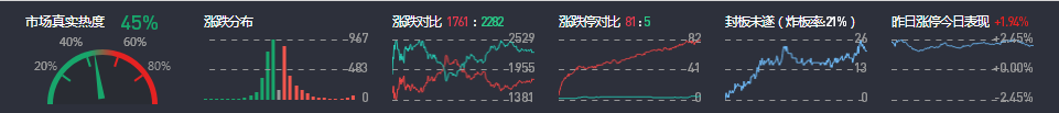 3、两市共1761只个股上涨,81只个股涨停;2282只个股下跌,5只个股跌停,14只股票炸板,炸板率21%。