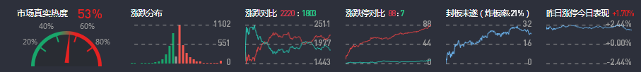 3、两市共2220只个股涨,88只个股涨停,除新股外涨停81只;1803只个股下跌,7只个股跌停,19只股票炸板,炸板率21%。